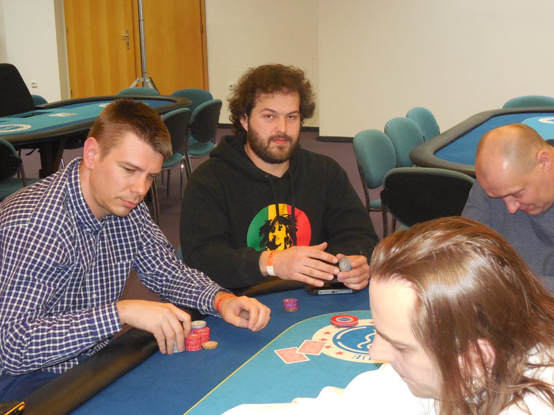Roman Kmínek na UTG otevřel po dlouhých minutách hru za 2.5k, soused Michal Magnus shovnul allin 8.1k a Pavla Benátčanová zvedla na 18k! Roman Kmínek vycouval.