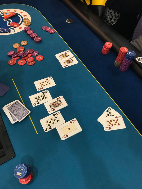 Michal Hamáček si připravil vysokou otvírku 1.6k chipů (4 bb). Když na to zareagoval Pjay zvýšením na 4k, bylo pravděpodobné, že se nikdo jiný už do hry míchat nebude. Tak se také stalo. Michal Hamáček s klasickou zvedačkou zároveň posílá allin 17.35k s A-K, Pjay s Q-Q v mžiku dorovnává.