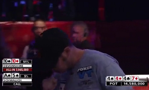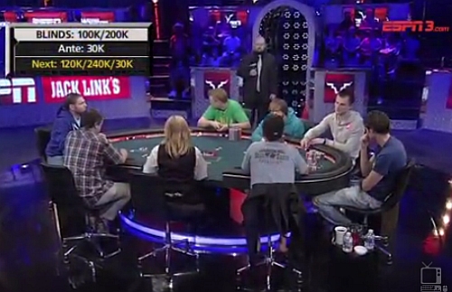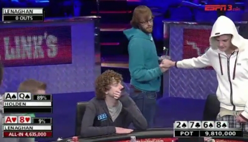 Lamb otevřel raisem na 1,2M, Staszko dorovnal a short Hewitt vyslal plnou za 10M. Ani jeden z hráčů (Lamb, STaszko) nejevil zájem o hru a vzdali se svých předchozích sázek.10:35 - Exkluzivní video od našeho VIP zpravodaje