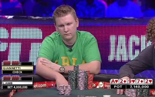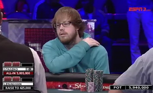 Chvilku na to se ukazuje forma Bena Lamba. Staszko raisuje z BTN na 425K a dorovnává pouze Lamb na BB. Na flopu A