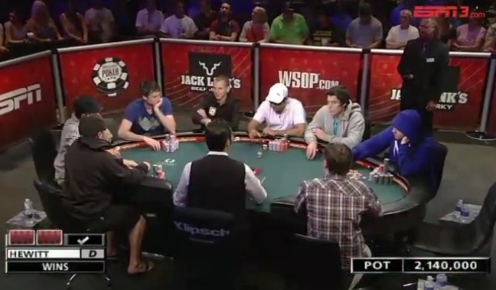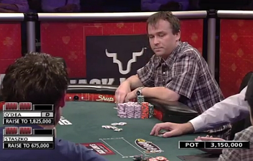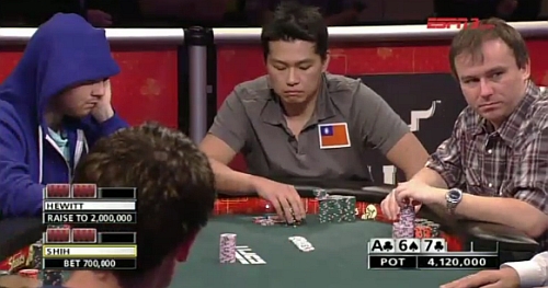 Staszko nejdříve bere milionový pot, když raisuje z big blindu na 400K a Hewitt na BB dorovnává. Hráči checkují až na river 8