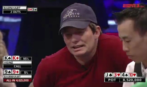 - Heinz na BTN raisnul na 1,1M, Staszko na BB 3-betnul na 3,3M a vyhrál pot. Důležitější ale je, že se do hry zatím příliš nezapojuje supershort Hewitt, na kterého právě míří blindy.
