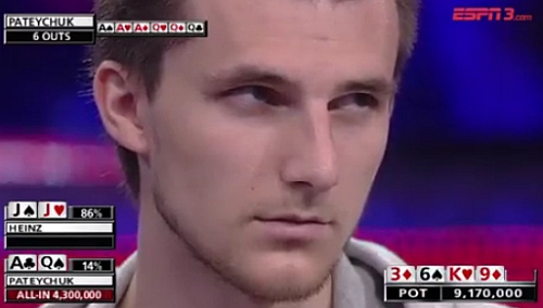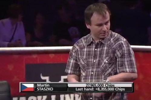 Právě proběhl krátký break, při kterém náš VIP zpravodaj na chviličku odchytil Martina Staszka. Jak sám komentoval, je ve velkém tranzu a volí nyní spíše vyčkávací taktiku, dokud nevypadne jeden ze shortstacků. Prý od něj v této chvíli nemáme očekávat nějaké větší hry. Všem fanouškům děkuje za podporu. Obsáhlejší rozhovor přineseme jak jen to bude možné.09:43 - Shorti na vypadnutí