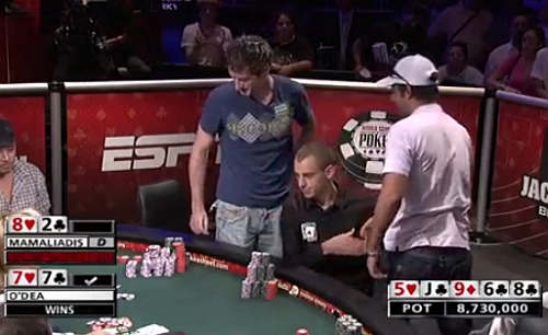 V poslední hře osmého dne Main Eventu WSOP 2011 otevřel O'Dea raisem na 1,1M z prostředka stolu. John Hewitt na big blindu shovnul allin za 3,875M a O'Dea rychle dorovnal: