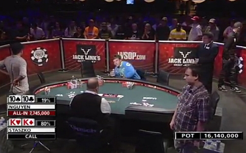 Martin Staszko už v tuto chvíli překonal všechny česko-slovenské rekordy vztahující se k Main Eventu WSOP. Dosáhl nejlepšího umístění i nejvyššího cashoutu. Překonat však může i Honzu Škampu v absolutní výši českého cashoutu. Škampa za vítězství na EPT Prague v prosinci 2009 inkasoval €682.000 (v přepočtu dle hendonmob $1.022.090). Staszko by tak v Main Eventu musel skončit nejhůře sedmý.16:06 - Blind Level