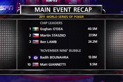 Přepiště dějiny! Historicky první český finálový stůl na World Series of Poker v podání českého hráče si vyzkouší Martin Staszko a nebude to jen tak ledajaký final table, ale dokonce ten nejbohatší finálový stůl roku. Největší turnaj, největší peníze a chipleaderem je český hráč, co víc si může tuzemský pokerový fanoušek přát. Těšme se na listopad! Velká gratulace míří do Třinca!11:44 - November Nine: Seating a chipcount
