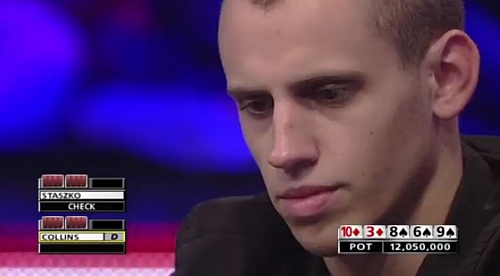Kartibůh stojí pevně u hráče ze severní Moravy. Staszko otevírá raisem na 950K a dorovnává pouze Collins na buttonu. Flop jde T