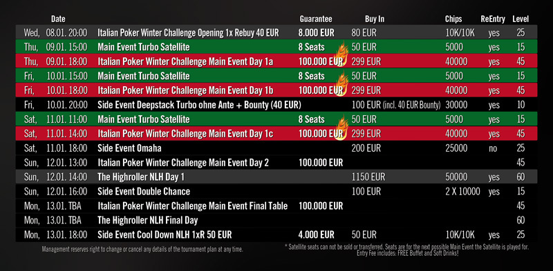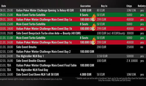 Ve čtvrtek 9.1 od 18:00 začne den 1A očekávaného Main Eventu Italian Poker Winter Challenge s garancí €100.000. Při buyinu €299 se hráči mohou těšit na luxusní 40.000 stack při blindech 45 min., díky čemuž si snadno můžete počkat na vhodnou příležitost pochytat italské rybky. V každém flightu můžete využít až dvě entries, odehraje se vždy 10 levelů s pozdní registrací 8 levelů. Pokud je na vás buy-in příliš vysoký, King’s Casino nabízí od 15:00 €50 turbo satelit s garantovanými 8 tickety.
