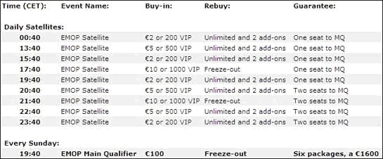 The European Masters of Poker™ (EMOP™) je zbrusu nová značka série živých turnajů, která startuje v Tallinu v Estonsku svou první zastávkou 20.-22. února a dále navštíví během roku 2009 také Kypr, Českou Republiku, Španělsko a Maltu. Posláním EMOP™ je dát příležitost hráčům všech kategorií zažít vzrušení při účasti na turnaji evropského formátu již za 10VIP bodů nebo €2. Nabízíme celkem 20 balíčků v hodnotách od €1,300 do €1,600, které budou zahrnovat startovného do turnaje €1,000+€100 a příspěvku €500 na cestovní výlohy a ubytování, respektive €200 na cestovní výlohy nebo ubytování. Celková hodnota všech balíčků je €29,600!