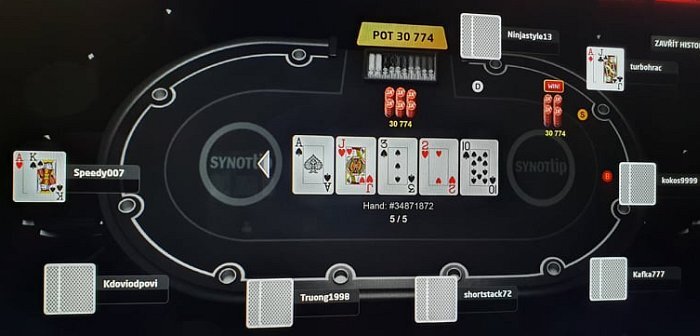 Tak jsme Speedyho předchozím příspěvkem jinxnuli a může přemýšlet o re-entry. Po pár raisech plná na flopu. Turbohrac podržel. Slovy karet A-K do A-J na A-J-3 flopu, blank turn i river.