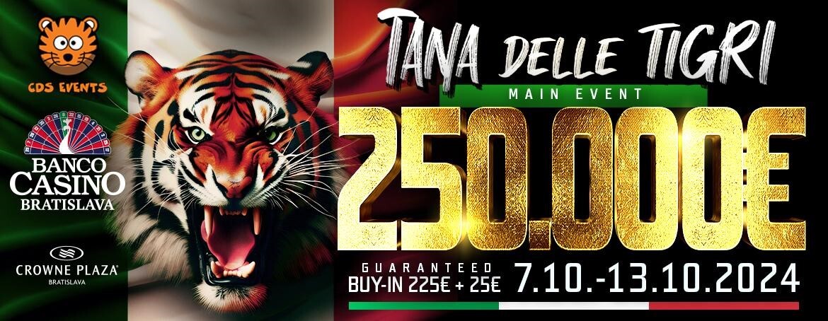 Dnes se bratislavské Banco Casino oblékne do italských barev, protože začíná Tana delle Tigri. Více než 250 italských hráčů dorazí do Bratislavy. Festival přináší Main Event s garancí €250.000 za €250 nebo třeba jednodeňák €50K GTD jen za €140.