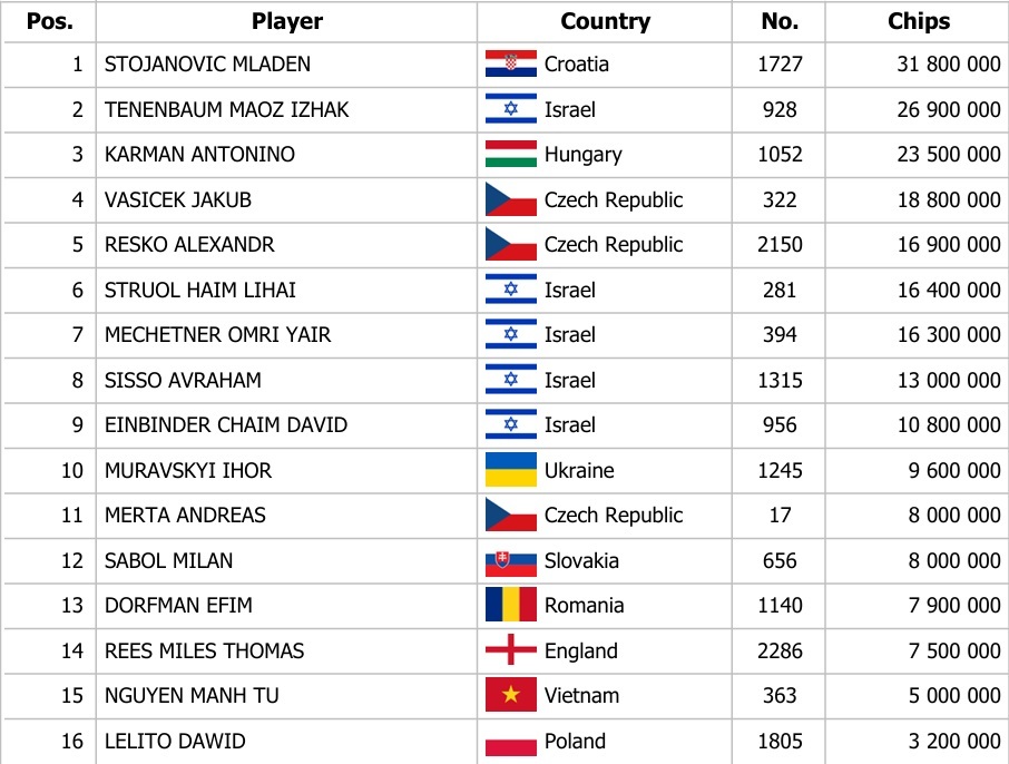 V poslední šestnáctce je jediný domácí slovenský reprezentant, Milan Sabol, ale zato česká pokerová škola má ve finále hned tři želízka v ohni. O turnajový triumf spojený s tučnou finanční prémií €64.150 budou usilovat, Jakub Vašíček, kterému patří 18.800.000 žetonů, druhým českým borcem je Alexandr Reško se stackem 16.900.000 chipů a třetím Čechem ve finále je Andreas Merta a jeho 8.000.000 žetonů.