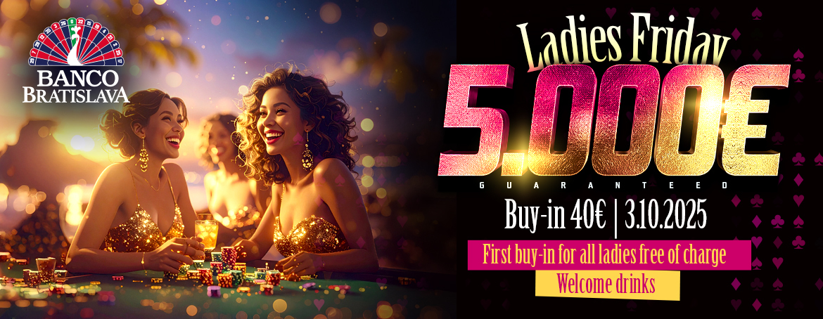 Závěrečný víkend pokerové ligy přinese páteční turnaj Friday Ladies s garantovaným prizepoolem €5.000 při buy-inu €40, všechny dámy mají první vstup do tohoto eventu zdarma.