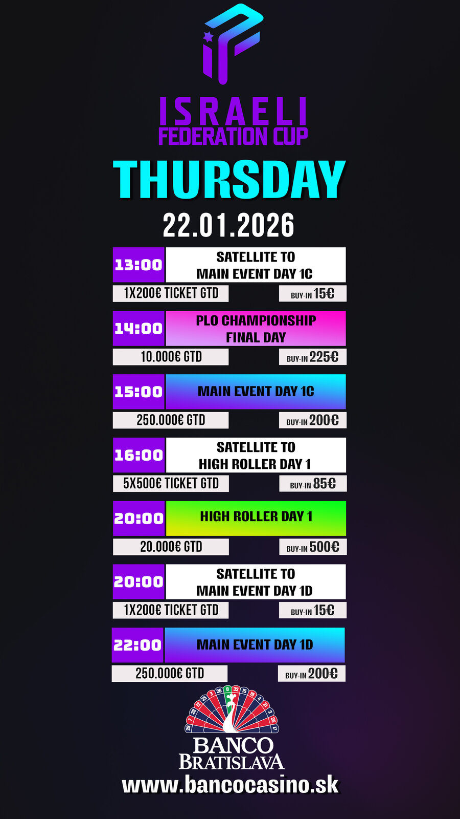V bratislavském Banco Casinu jsou už odehrány dva flighty Israeli Federation Cup Main Eventu €250K GTD. Už v prvním flightu uspěli dva čeští hráči. Izraelský festival nabírá na obrátkách a nabízí bohatý nejen turnajový program.