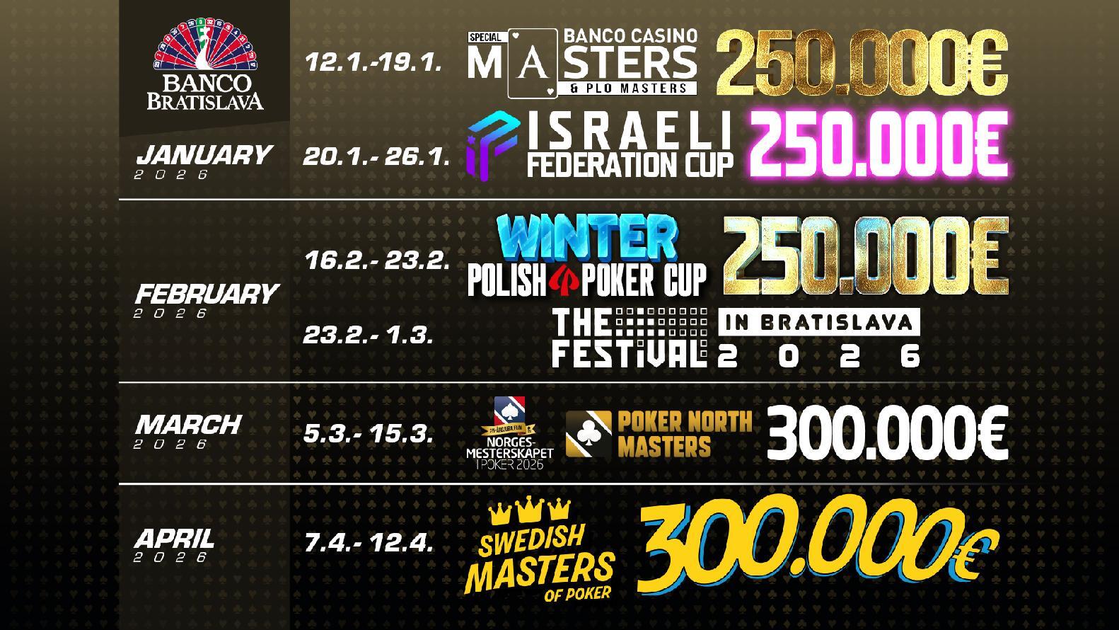 soutěž - 5x sleva €25Pokerový rok 2026 odstartuje v bratislavském Bancu dvěma zásadními událostmi, tradiční už 43 edicí Banco Casino Masters €250K GTD a novinkovým Israeli Federation Cupem €300K GTD. Tuto sobotu Super Saturday €10K GTD.