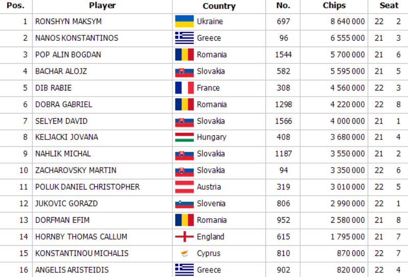 Po několika hodinách se vykrystalizovala finálová šestnáctičlenná sestava, ze které vzejde už 43 šampion této oblíbené série. Chipleaderem finálového dne je Ukrajinec Maksym Ronshyn se stackem 8.640.000 v žetonech.