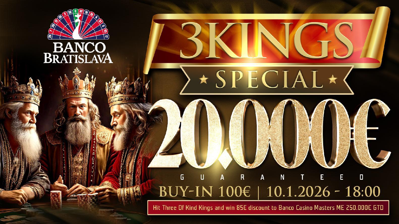V sobotu 10.1. 2026 se v Bancu uskuteční od 18:00 turnaj Three Kings Special s buy-inem €100 a garancí €20.000. Sobotní event přináší i výbornou bonusovou akci. Pokud se vám během turnaje podaří trefit set králů, získáte slevu €85 do nadcházejícího Main Eventu Banco Casino Masters €250K GTD, jehož buy-in činí €170.