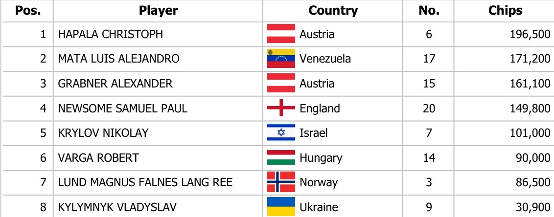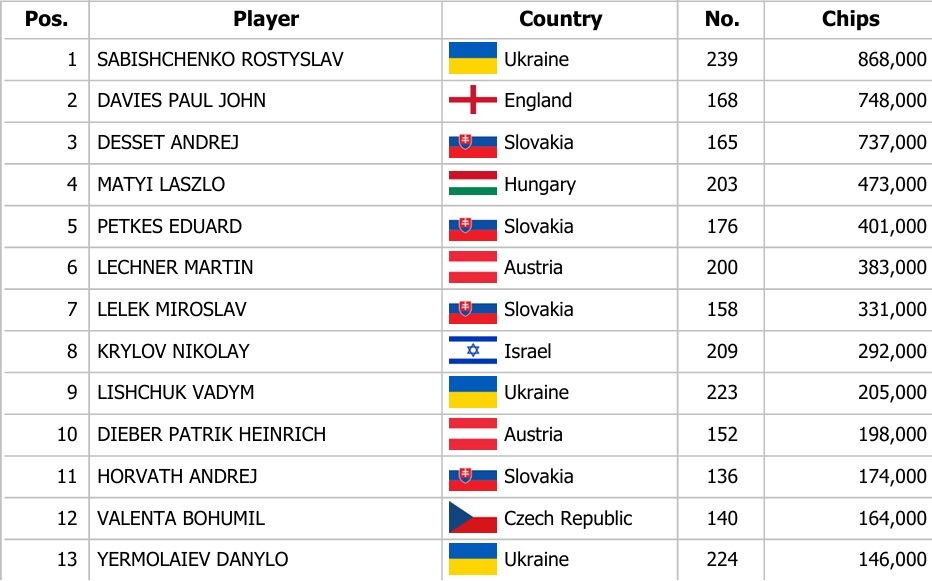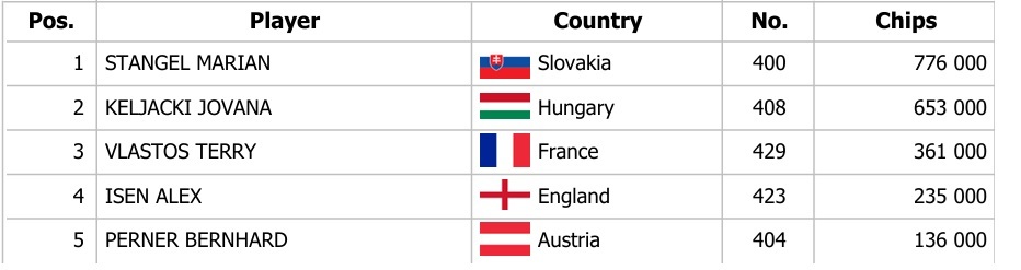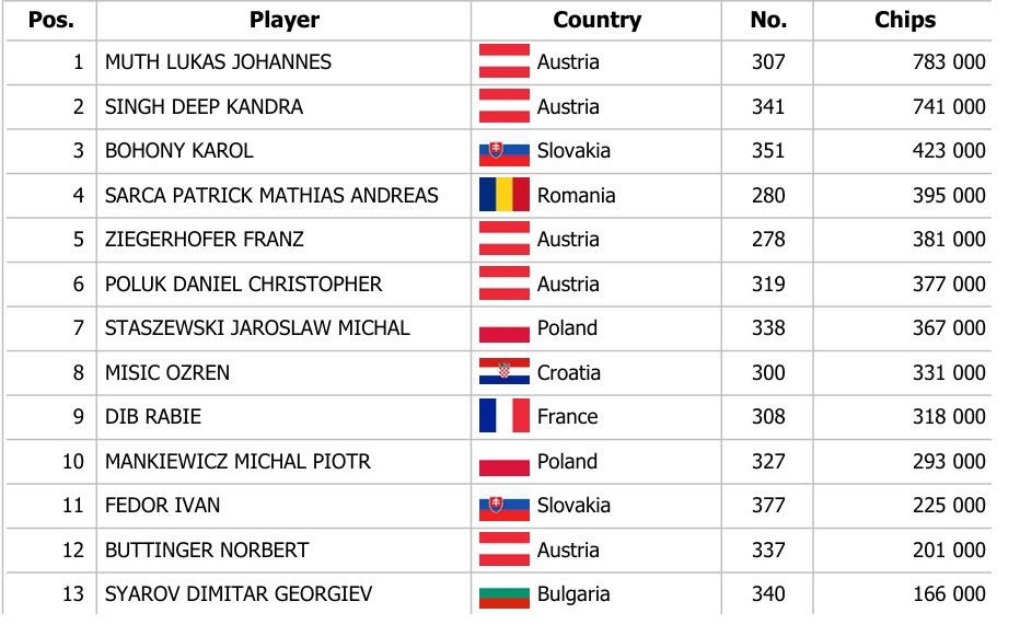 Hlavní turnaj Banco Casino Masters s pořadovým číslem 43 nese garanci €250.000, a to při vstupném pouhých €170. Včera se odehrál třetí hrací den Main Eventu, který během otevřené registrace zaznamenal 125 entries, z nichž jsme viděli 13 postupujících. Největší stack si zajistil Lukas Johannes Muth z Rakouska, což znamenalo také vyplacení chipleader bonusu €1.500.