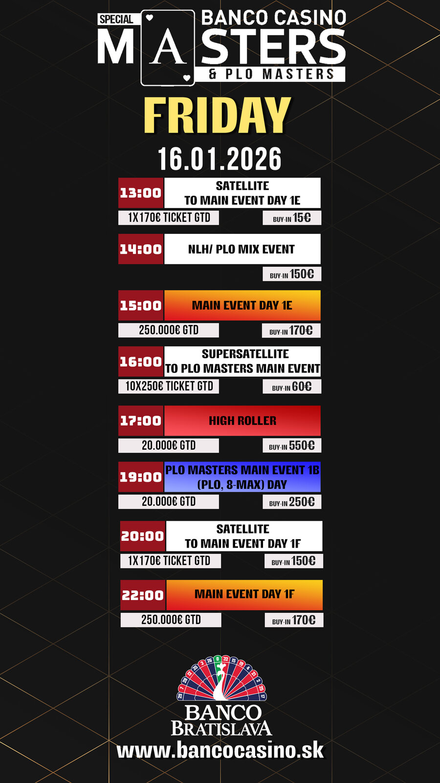 Březen bude v bratislavském Banco Casinu patřit Norskému Mistrovství v pokeru a půjde už o 25. výročí, takže se dá očekávat velká účast hráčů z Norska, ale i z celé Evropy. Poker North Masters garantuje prizepool ve výši €300.000 při buy-inu €400. Zaručené budou i nekončící cash game sessions, to vše od 5. 3. - 15. 3. 2026.
