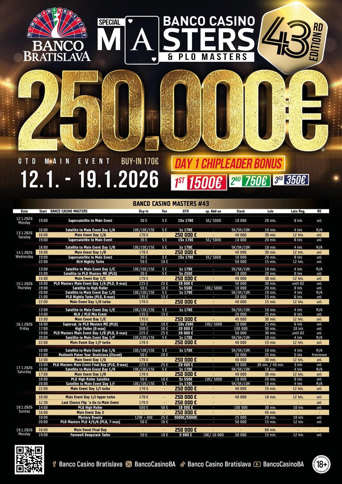 Pokerový rok 2026 začne v bratislavském Banco Casinu událostí, která se stala tradičním symbolem kvality a velkých výher. Od 12. do 19. ledna otevře své brány již 43. edice této oblíbené pokerové série, Banco Casino Masters.