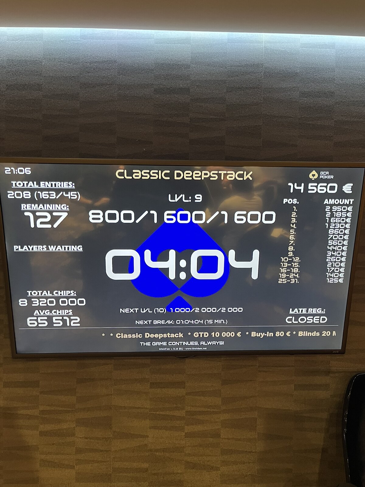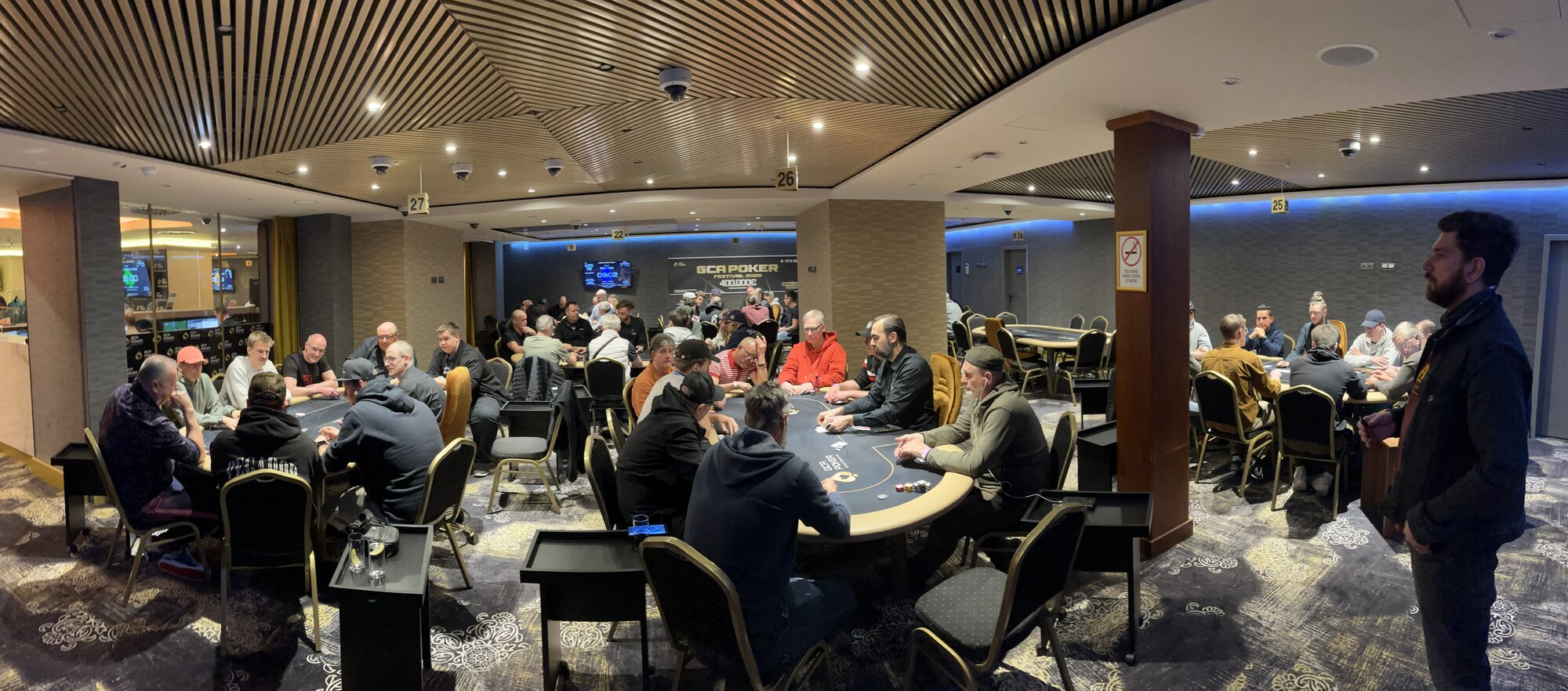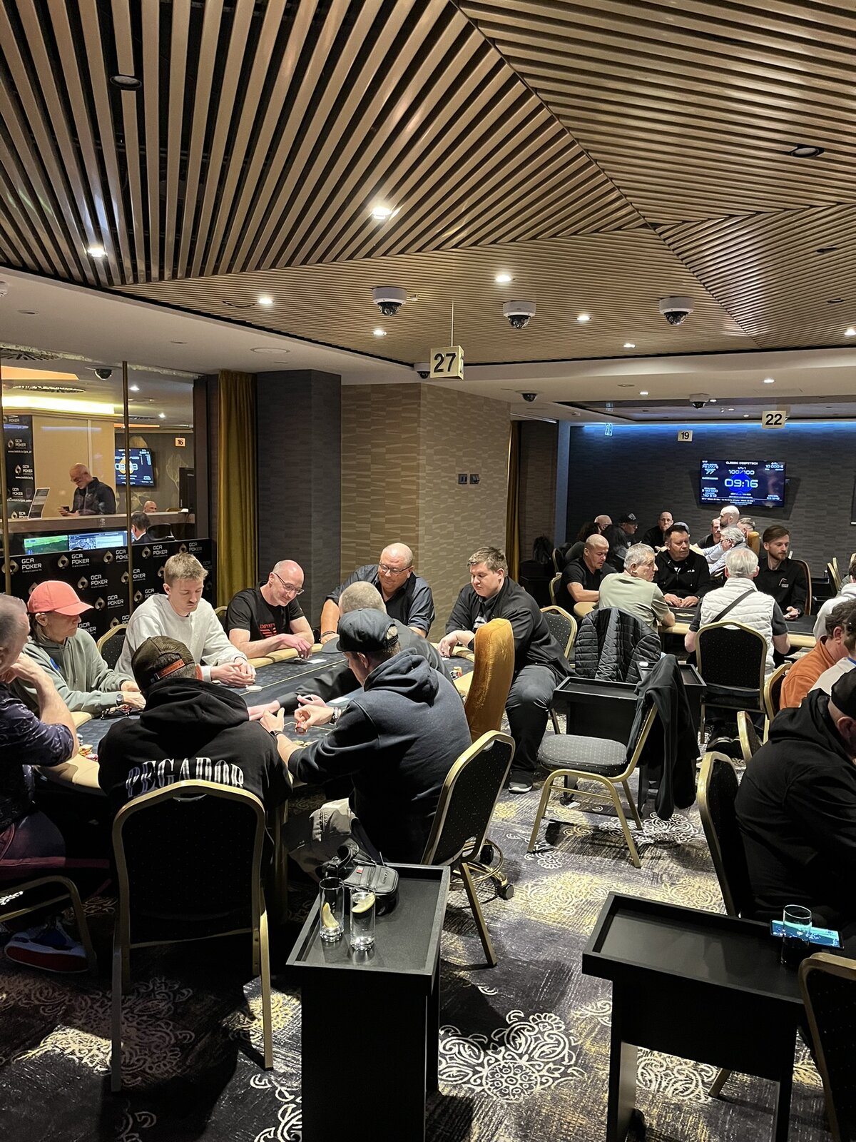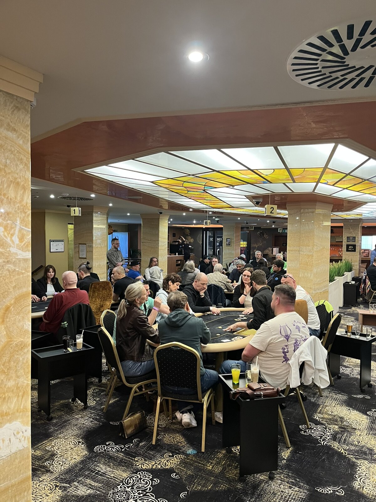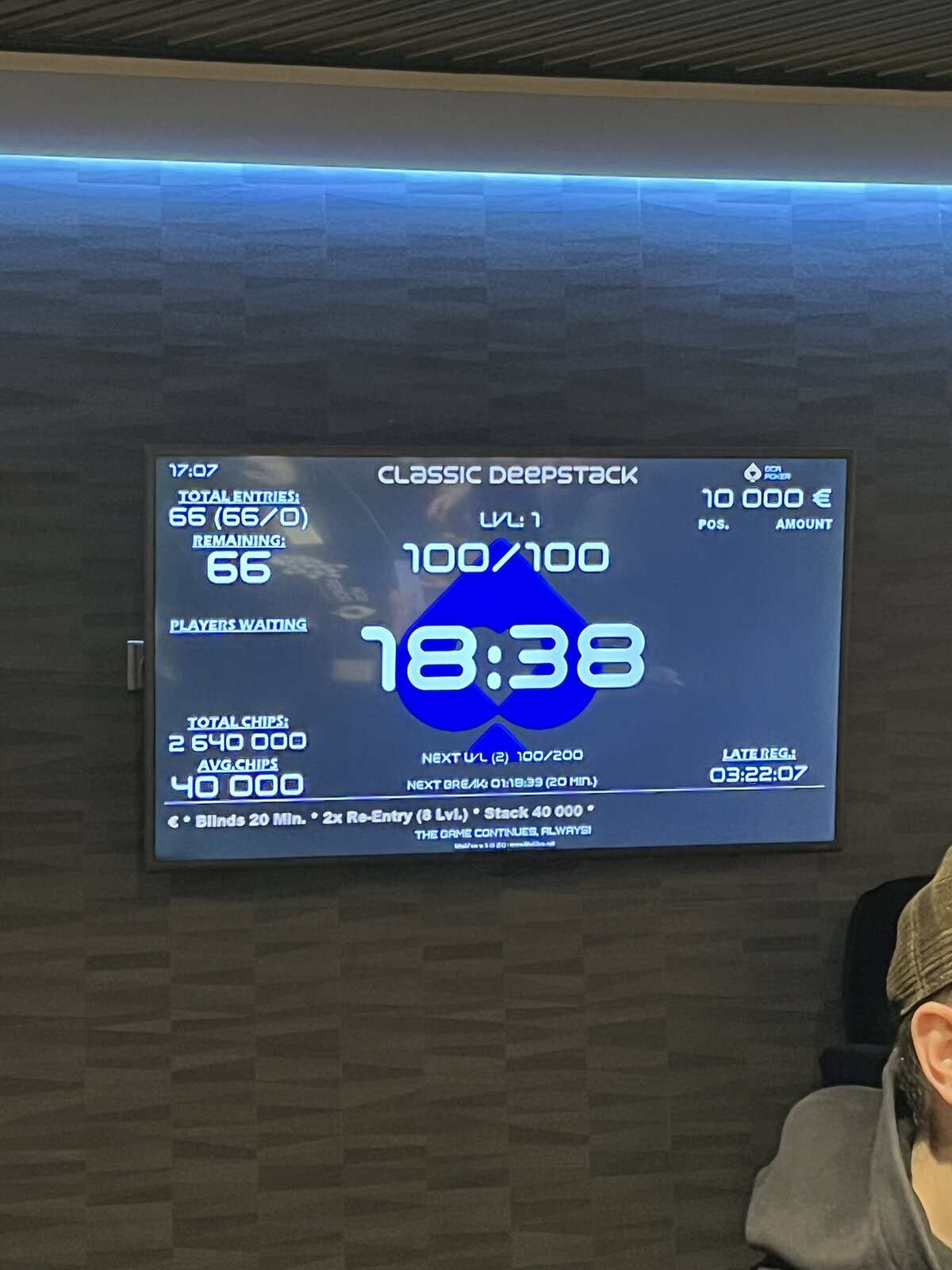 Turnaj odstartoval a v sále panovala velmi příjemná, až rodinná atmosféra. Struktura turnaje je nastavena svižně — žádné šestihodinové pozdní registrace a hodinové levely. Pozdní registrace tohoto konkrétního turnaje je nastavena na 8 × 20minutových levelů s půlhodinovou přestávkou po konci čtvrtého levelu.