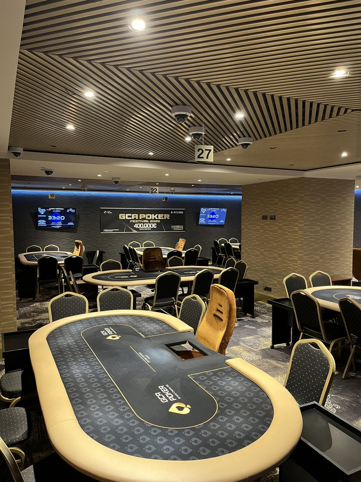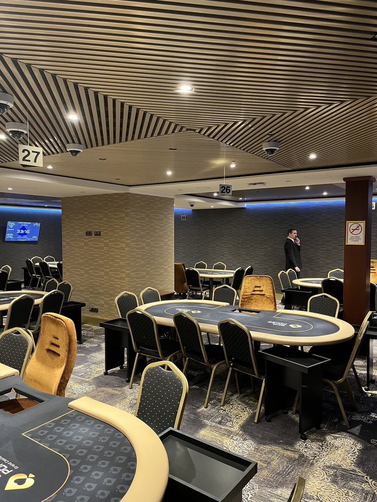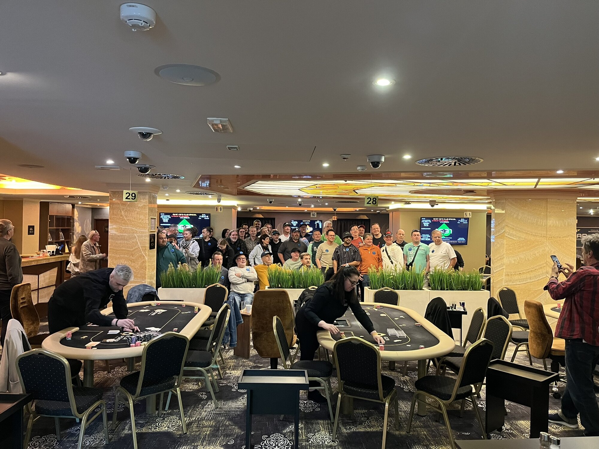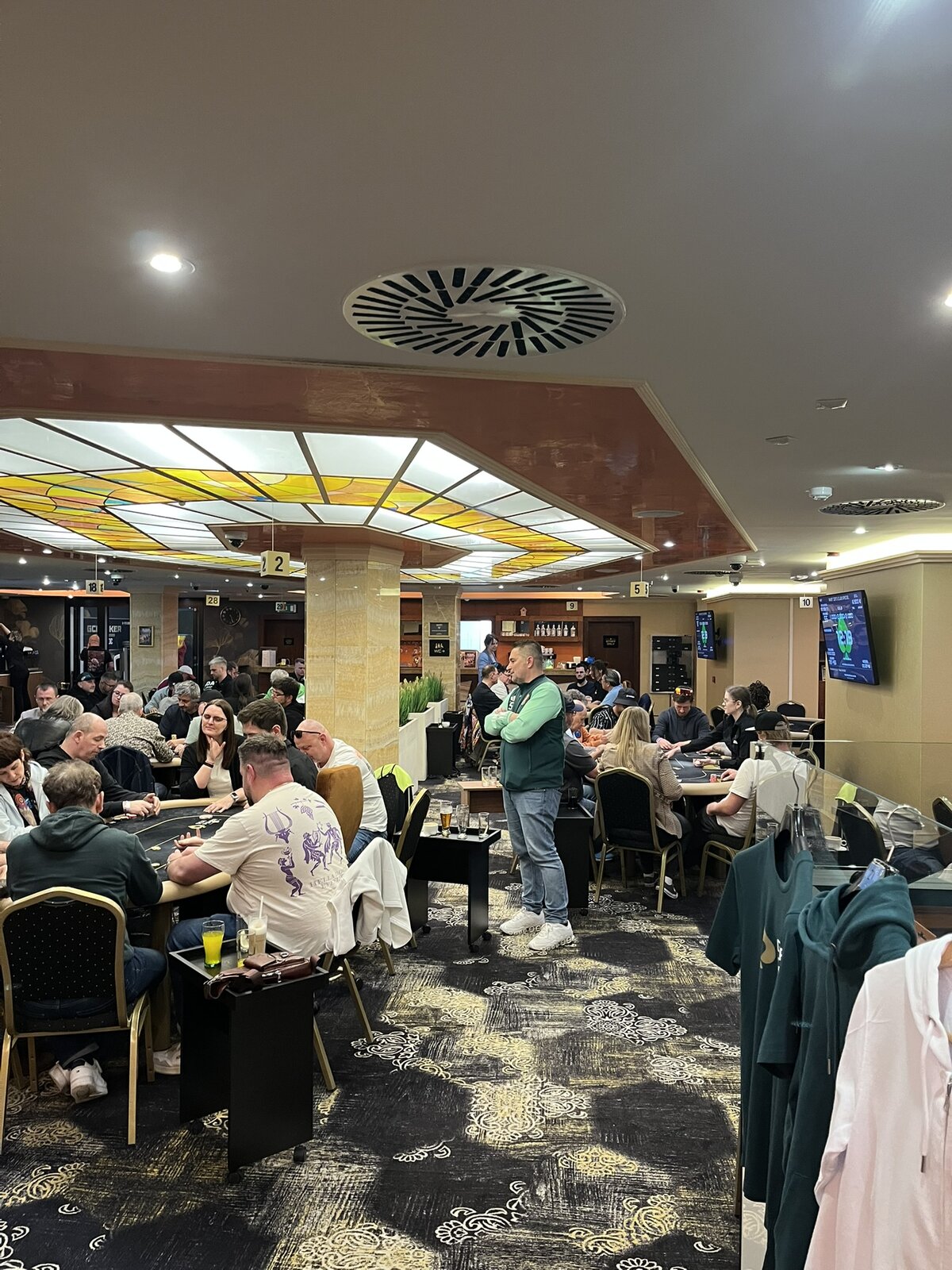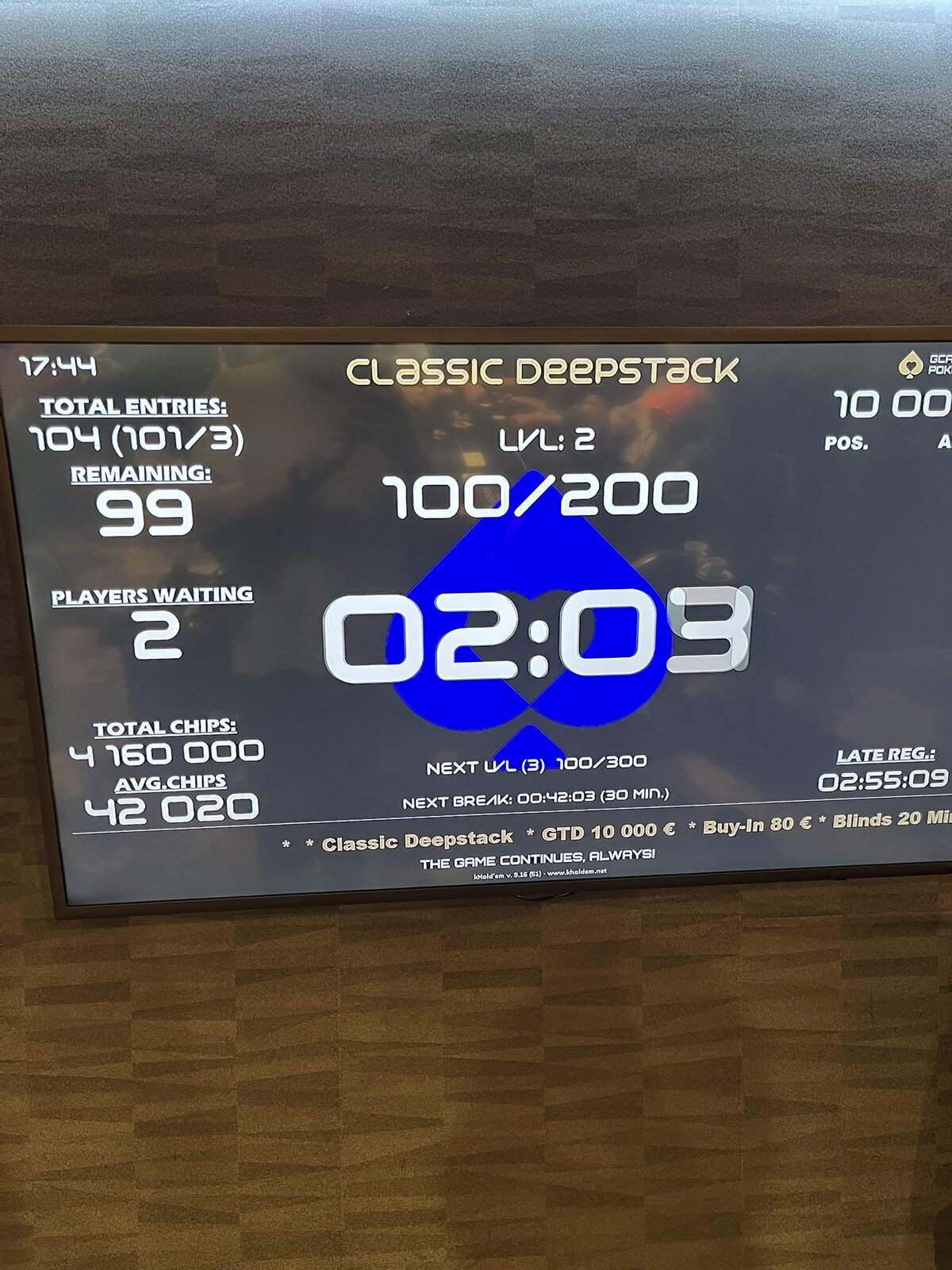 Turnaj odstartoval a v sále panovala velmi příjemná, až rodinná atmosféra. Struktura turnaje je nastavena svižně — žádné šestihodinové pozdní registrace a hodinové levely. Pozdní registrace tohoto konkrétního turnaje je nastavena na 8 × 20minutových levelů s půlhodinovou přestávkou po konci čtvrtého levelu.