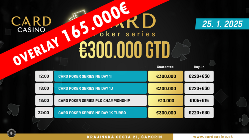 Card Casino Šamorín pořádá tento týden vícedenní event Card Casino Series s buy-inem €220 +€30 a garancí €300.000. Součástí garantovaného prizepoolu je i devět tiketů do WPT Prime Bratislava v hodnotě €1.100.