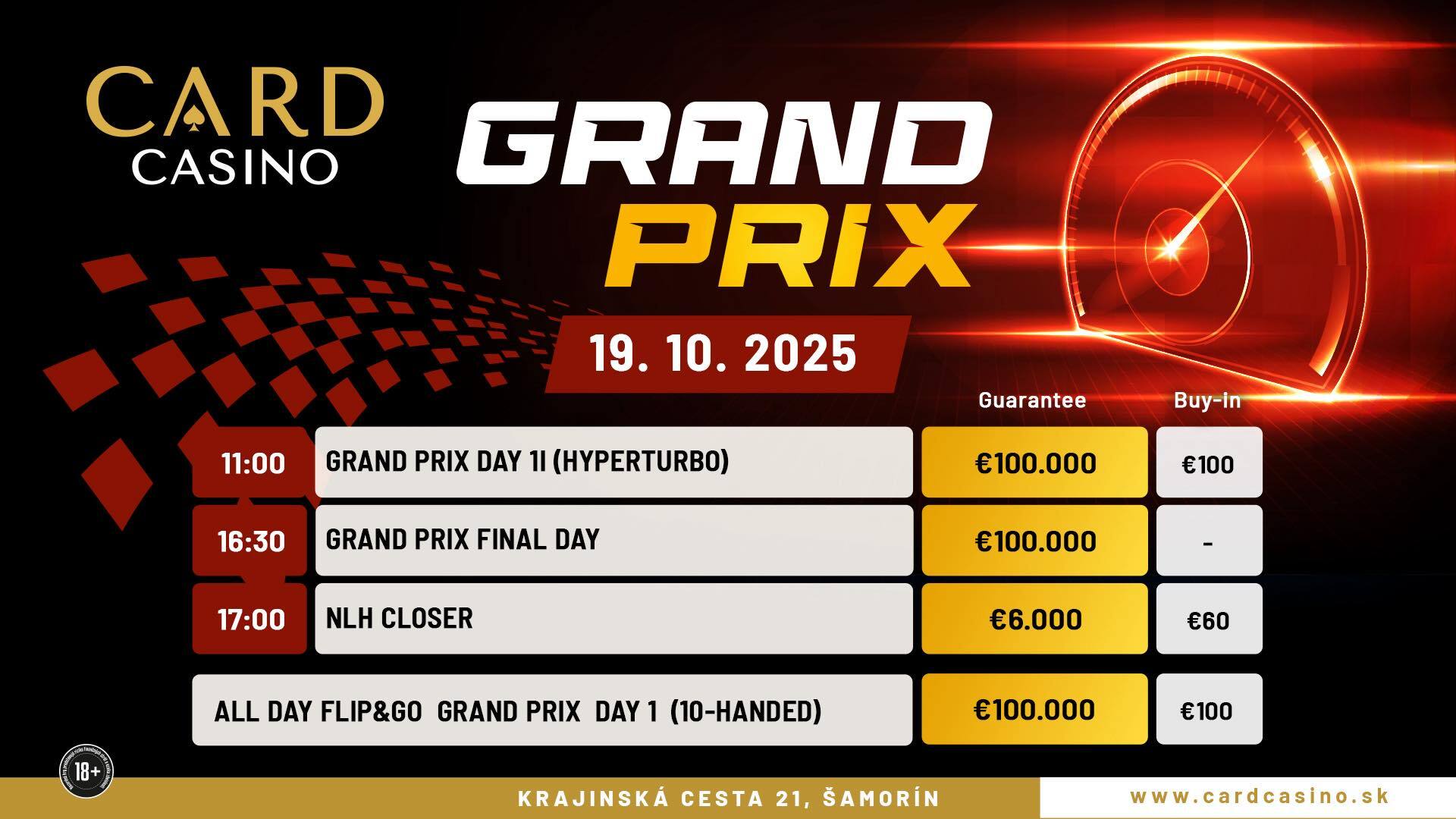 Kompletní rozpis turnajů a všechny informace o událostech v Card Casinu najdete na www.cardcasino.sk nebo se informujte přímo v největším slovenském kasínu na adrese Krajinská cesta 21, Šamorín.