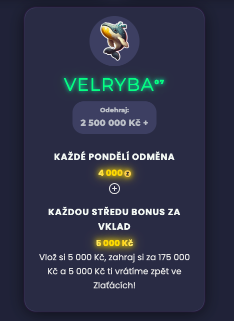 Na příklad na nejvyšším levelu Velryba tě čeká každé pondělí 4.000 ve zlaťácích, a každou středu bonus za vklad 5.000 Kč, který získáš po "vyčištění"!