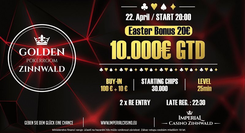 Páteční večer si zahrajete na Cínovci minimálně o garantovanou částku €10.000. Buy-in do večerního turnaje čítá pouze €110, navíc se všichni zúčastnění mohou těšit na pozdně velikonoční bonus v hodnotě €20.