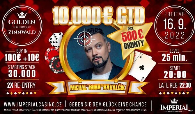Páteční večer si zahrajete na Cínovci minimálně o garantovanou částku €10.000. Buy-in do večerního turnaje čítá pouze €110, navíc se všichni zúčastnění mohou těšit na bounty €500 na VIP hráče - Michala Kavalčika.