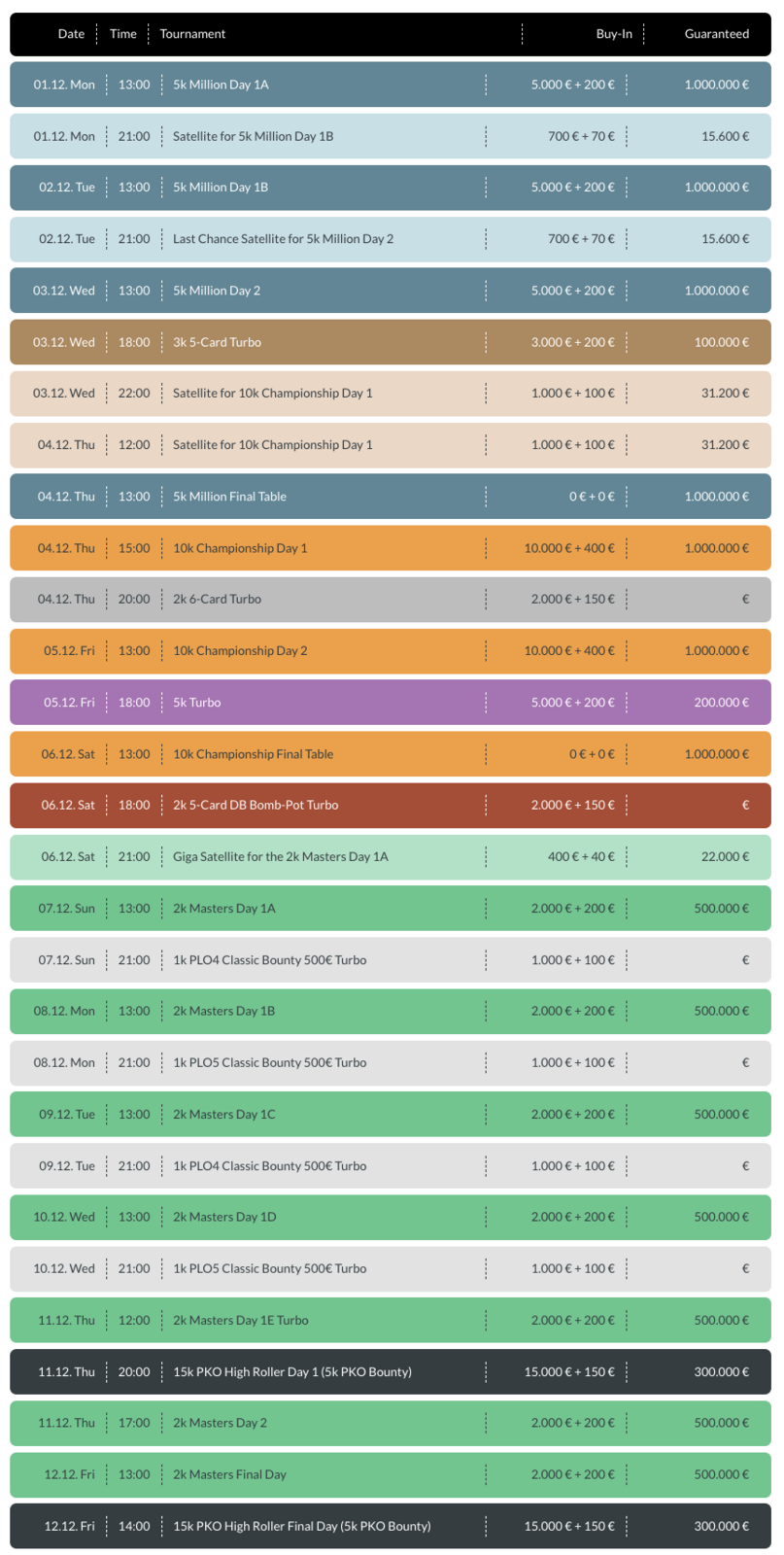 Během dvanáctidenního festivalu je na programu celkem 17 PLO eventů, které pokrývají široké spektrum buy-inů i formátů. Série láká jak strategicky založené hráče deep-stacků, tak milovníky dynamické a rychlé akce.