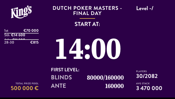 Main Event Dutch Poker Masters s garancí €500.000 jde do svého velkého finále. Ve hře zbývá 30 hráčů.