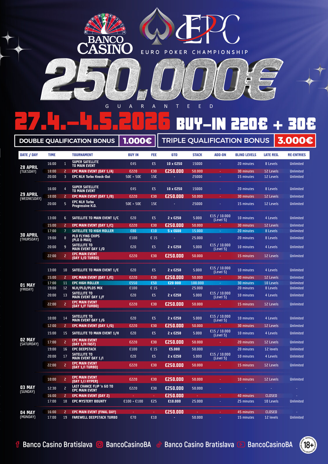 Main Event Euro Poker Championship bude garantovat €250.000 za buy-in €250 a přinese jedinečný pokerový zážitek. Hlavní turnaj přinese i kvalifikační bonus za vícenásobný postup – přesněji dvojitá kvalifikace vám zaručí odměnu €1.000 a za trojnásobnou kvalifikaci budete odměněni až €3.000 bonusem!