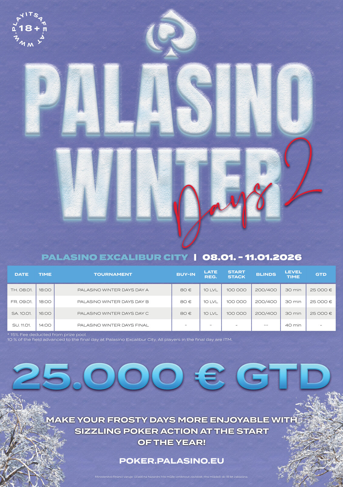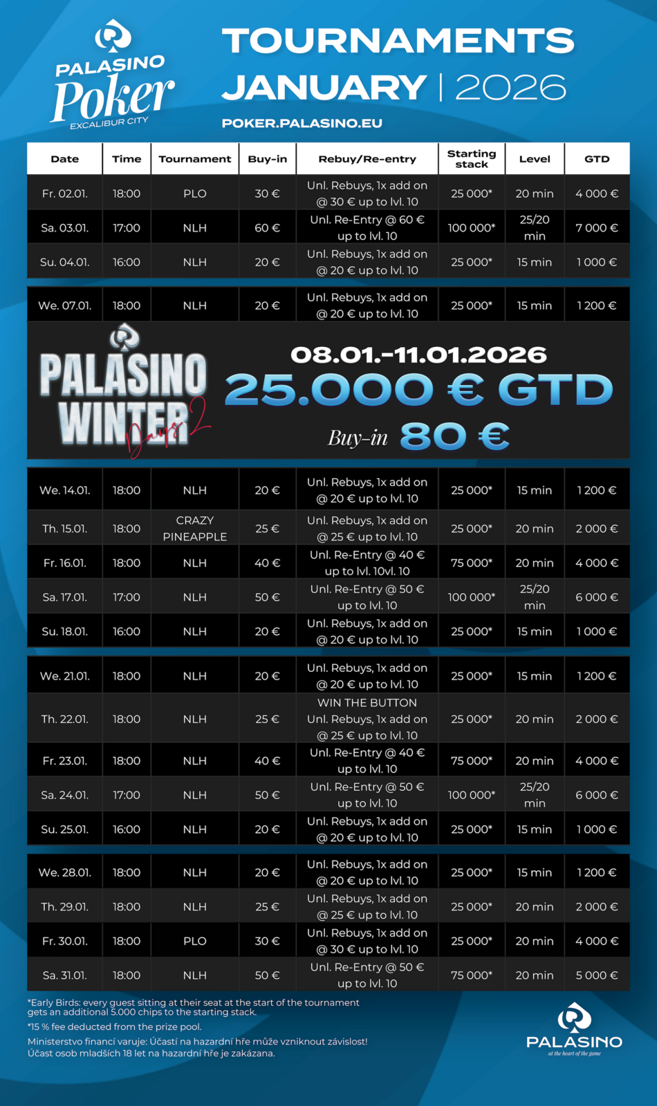 Palasino Excalibur City se i na začátku nového roku 2026 těší na vaši návštěvu! Turnajová akce na vás čeká pět dní v týdnu. Ty nejzajímavější eventy jsou v programu připraveny vždy v sobotu. Highlightem lednového programu jsou Palasino Winter Days s garancí €25.000.