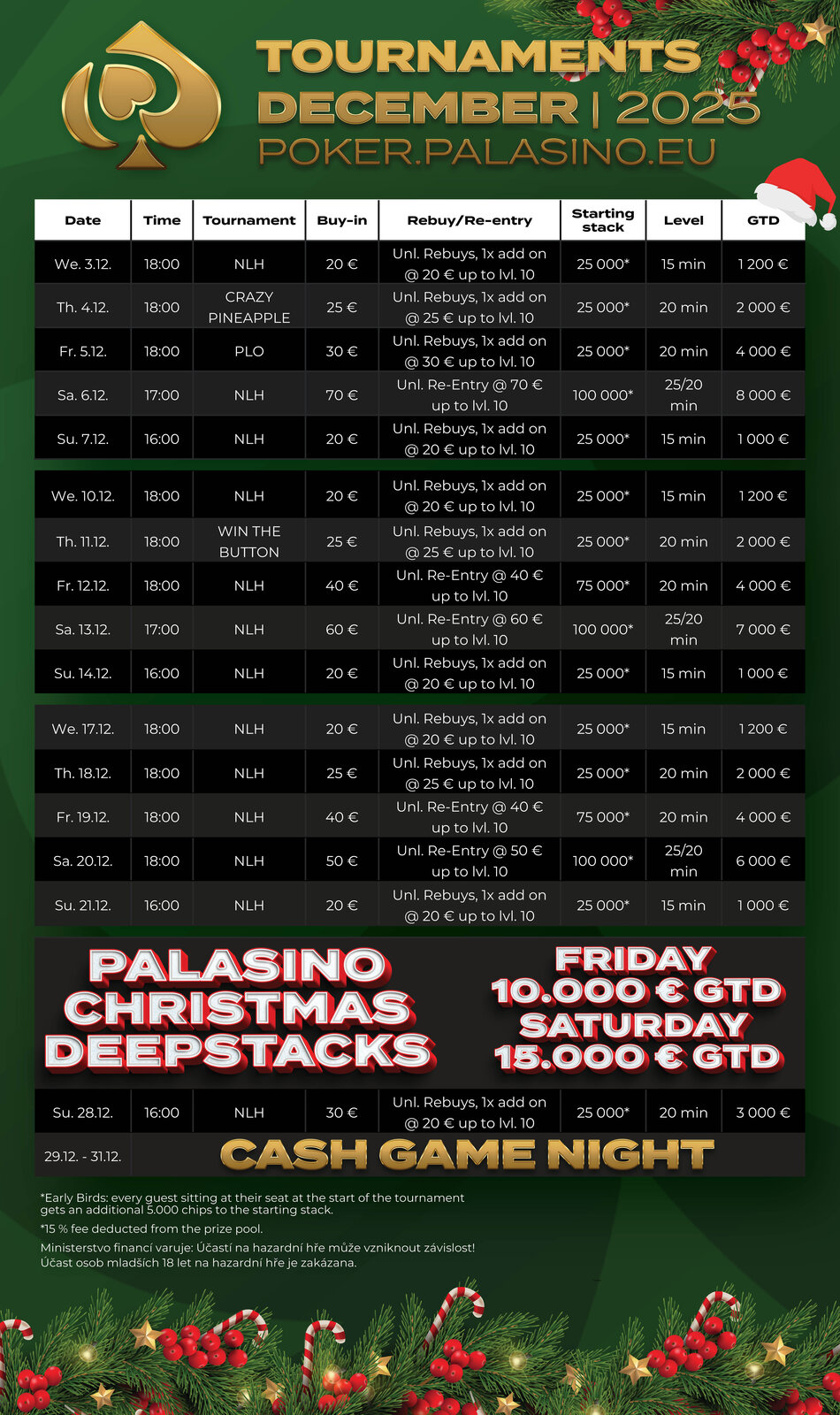 Prosincové soboty nabídnou ty největší garance měsíce. Hned 6. prosince se můžete těšit na €8.000 GTD při buy-inu €70. O týden později, 13. prosince, vás čeká €7.000 GTD za buy-in €60. A 20. prosince uzavře předvánoční pokerovou smršť NLH turnaj s garancí €6.000 a buy-inem €50.