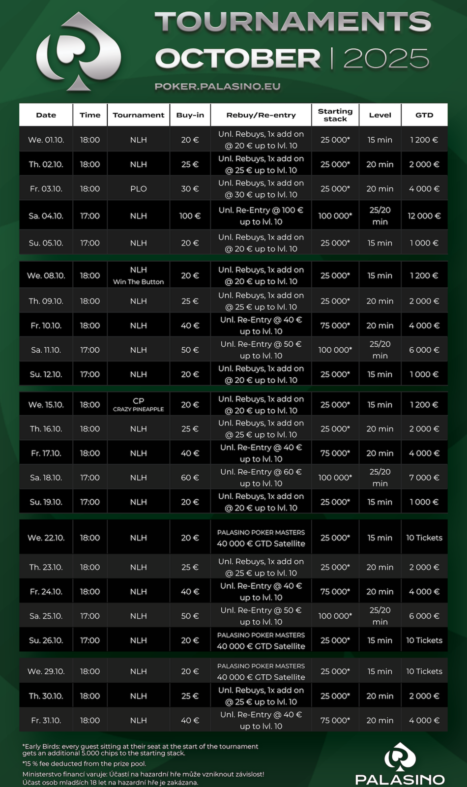 Palasino Excalibur City se i v říjnu těší na vaši návštěvu! Turnajová akce na vás čeká pět dní v týdnu. Ty nejzajímavější eventy jsou v programu připraveny vždy v sobotu. Celkové garance atakují hranici €70.000!