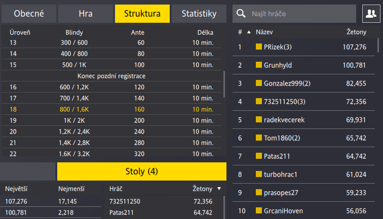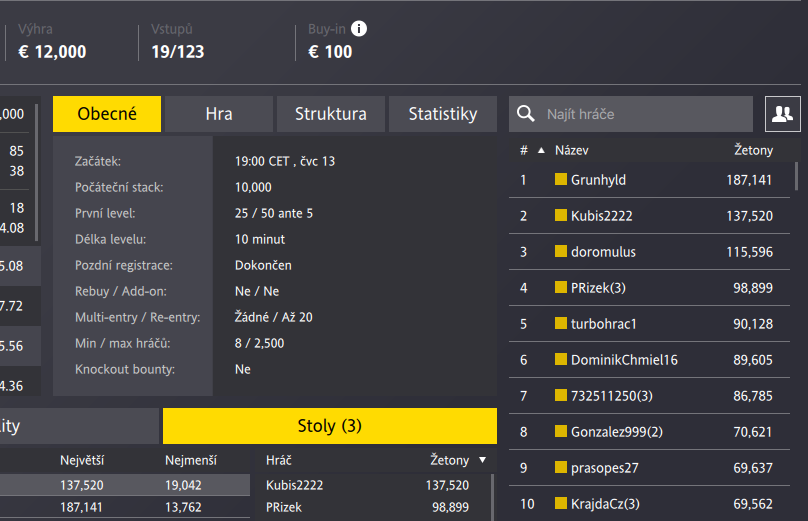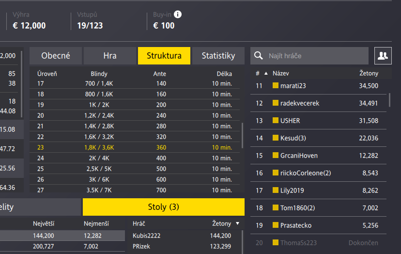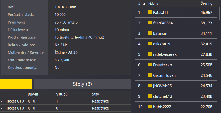 Dnešní garance €12.000 je při tradičním buy-inu €100 postavena na 120 entries. Aktuálně jsme ani ne v polovině tohoto čísla (45 entries). Pozdní registrace je otevřena 15 levelů po 10 minutách, tj. společně s breaky do 21:40.