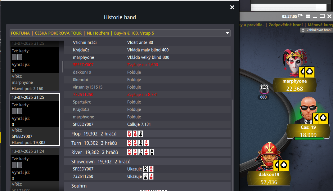 Zatímco ŠťastnýPtáček se drží ve hře s 12.357 v žetonech (bb250), jeho druhé já NešťastnýPtáček se již s červencovou ČPT rozloučil a re-entry zatím nevyužil.