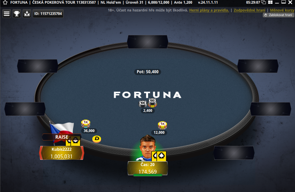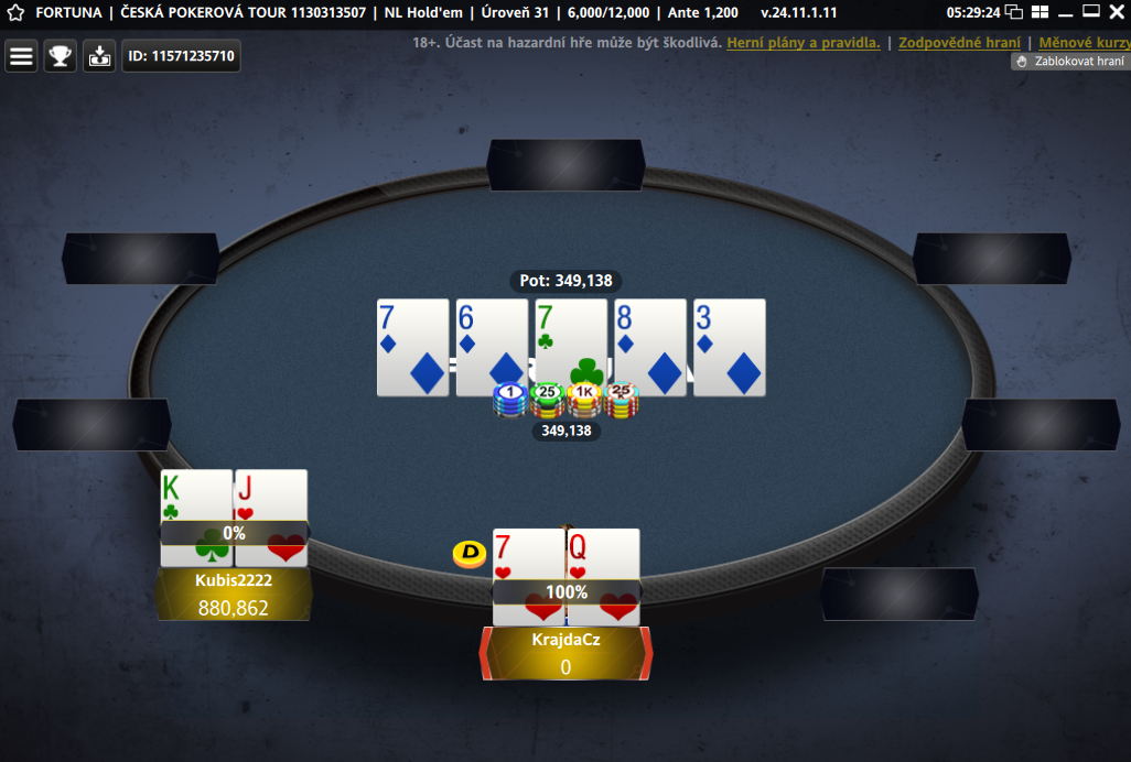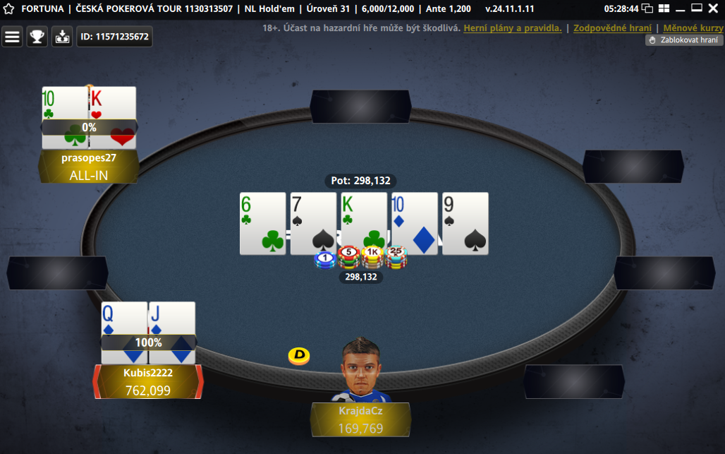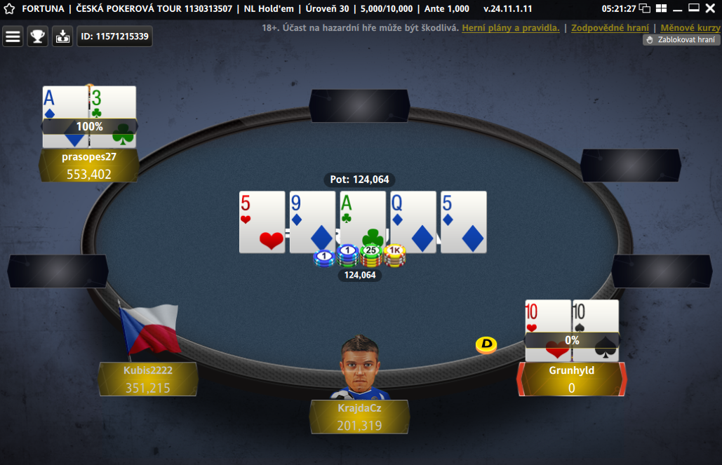 Celý turnaj odehrál s českou vlajkou v avataru. Kdo jiný by měl vyhrát Českou Pokerovou Tour! V závěrečné handě turnaje držel Kubis esa, Krajda zatlačil se svým A-8s a Kubis už neměl problém s callem soupeřova 5bet shoveu.
