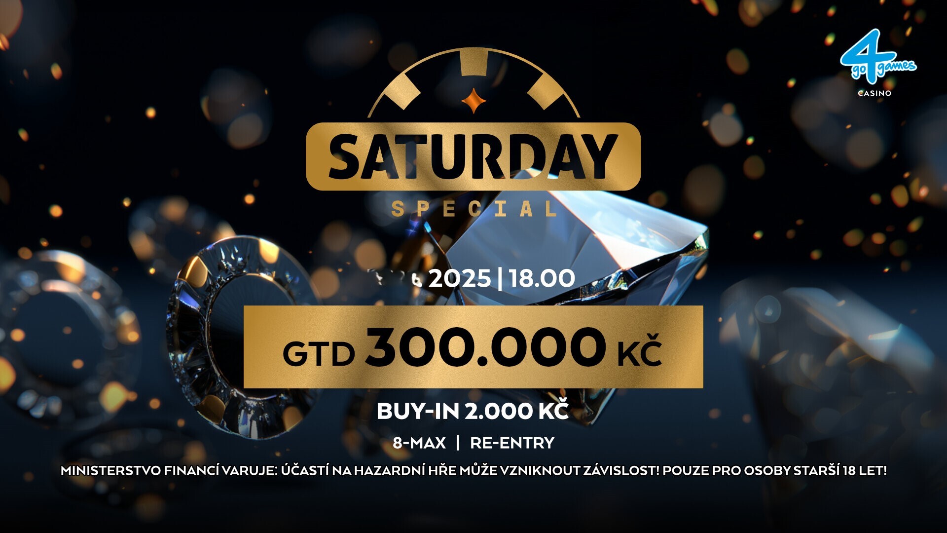 Na sobotu je v hodolanském resortu Go4games připraven turnaj Saturday Special 8-Max, který má garantovaný prizepool 300.000 Kč a vstupné je 2.000 Kč. Start sobotního eventu je v 18:00, na začátku hráči obdrží 30.000 v žetonech a úrovně se budou měnit po 25 minutách.