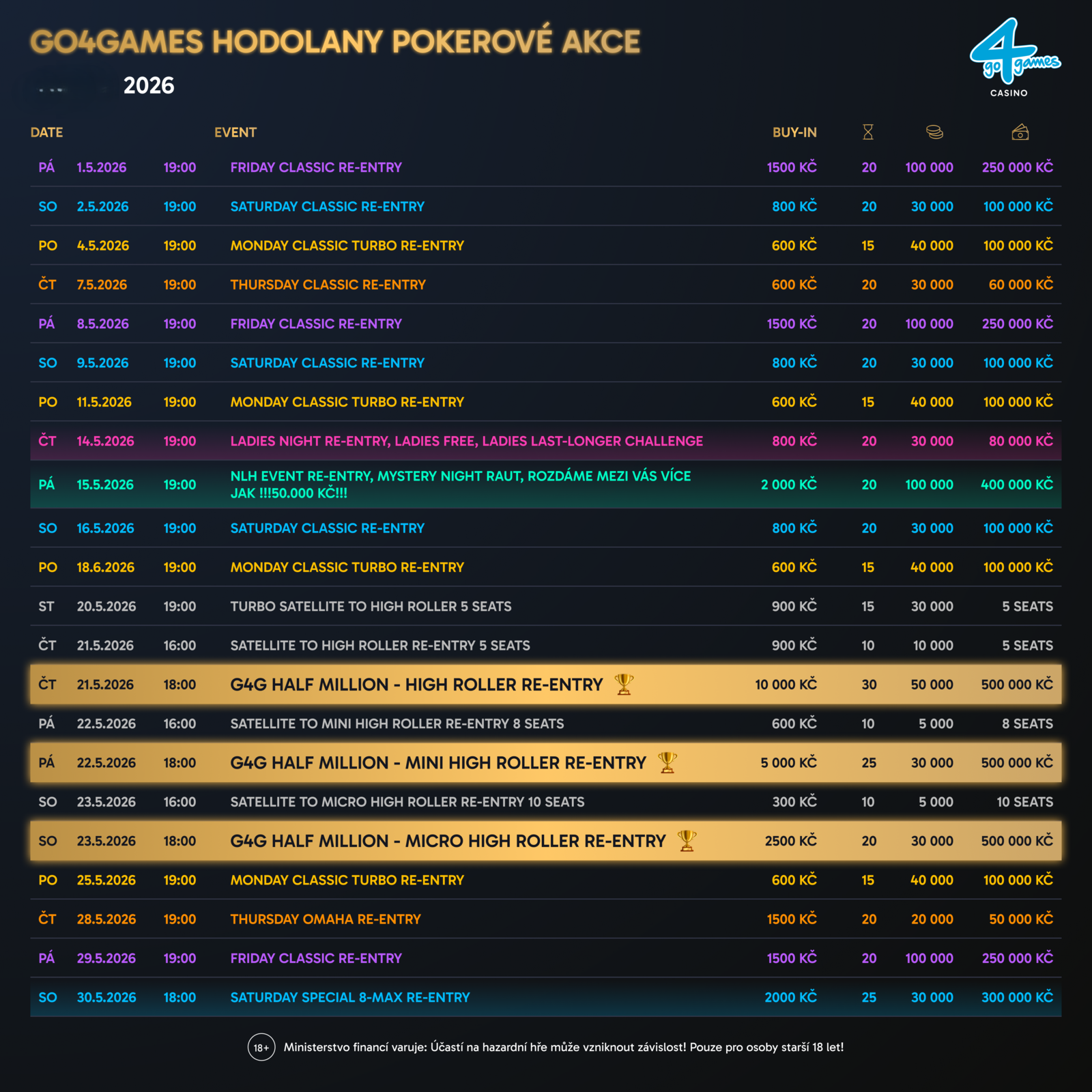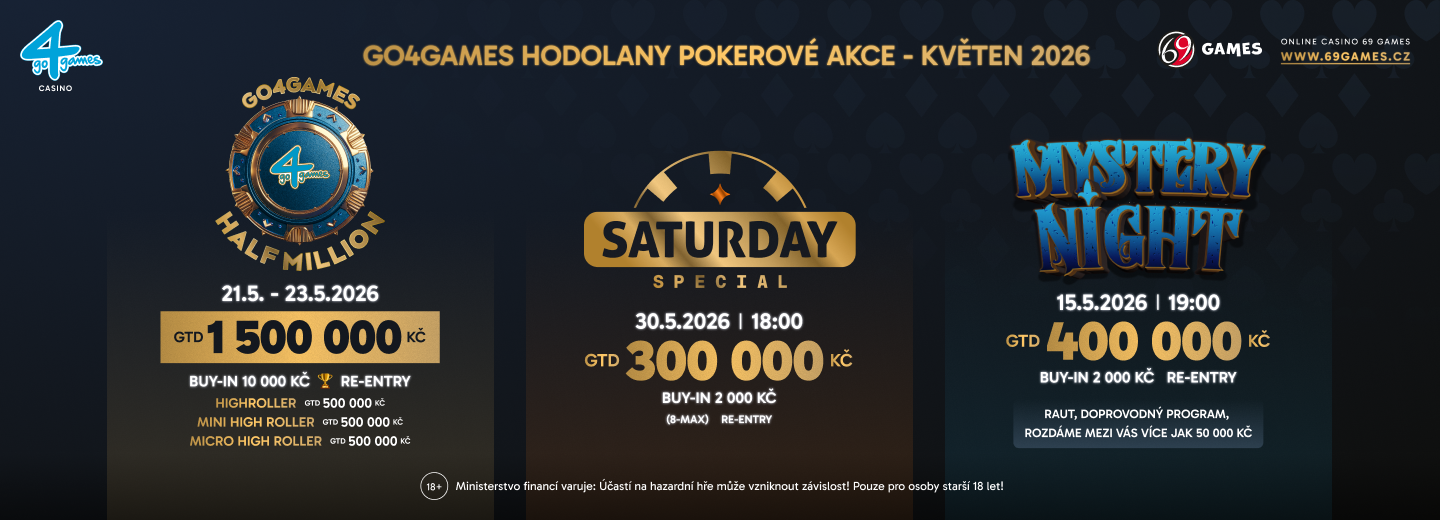 První květnový víkend proběhnou v hodolanském resortu Go4games v Olomouci tradiční jednodenní turnaje, Friday Classic 250K GTD a Saturday Classic 100K GTD.