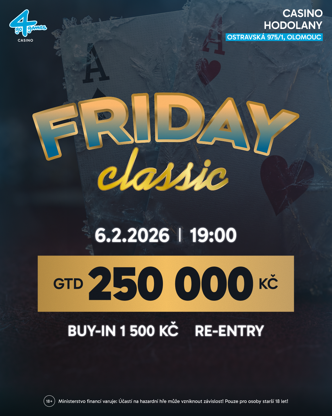 Páteční turnajovou klasikou je od 19:00 event Friday Classic, který nabízí garantovaný prizepool v minimální výši 250.000 Kč. Buy-in činí 1.500 Kč, starting stack je komfortních 100.000 v chipech a blindy se mění po dvaceti minutách.