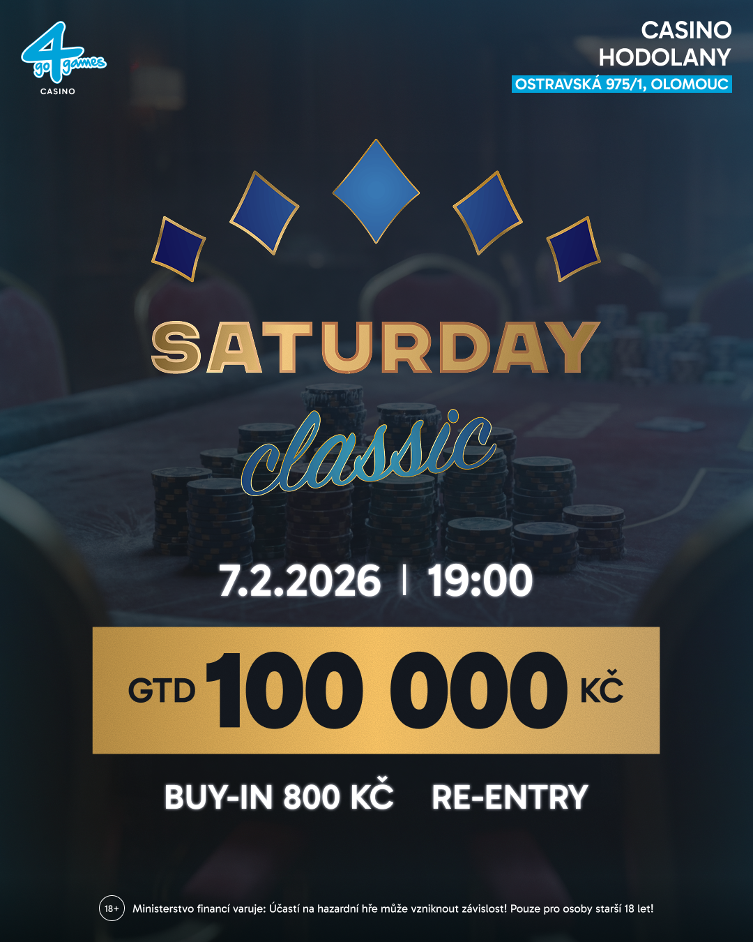 Tradičním sobotním turnajem v Hodolanech bude Saturday Classic se shodným startem jako páteční event, tedy v 19:00. Lidové vstupné pouhých 800 Kč a garantovaný prizepool 100.000 Kč, to je sobotní turnaj v Olomouci. Starting stack je 30.000 v žetonech a blind levely jsou jako v pátek také dvacetiminutové.