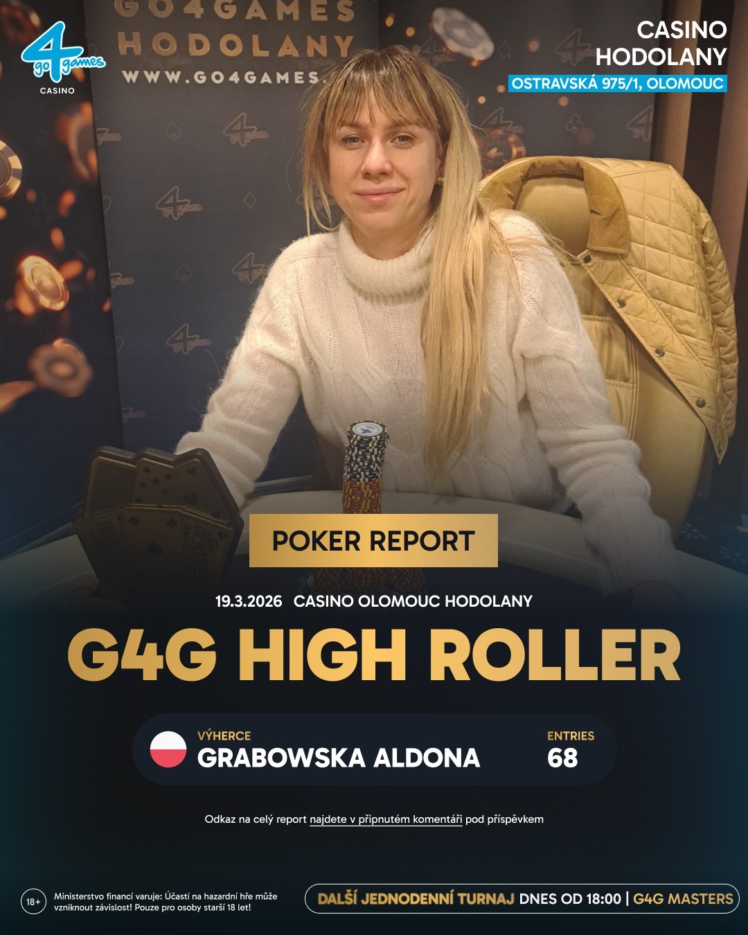 Pátek od 18:00 bude patřit druhému jednodennímu eventu, G4G Masters, který garantuje prizepool 300.000 Kč za vstupné 5.000 Kč. Hrát se bude ve formátu 8-max. Připraven je dnes také druhý startovní flight Main Eventu 2M GTD.