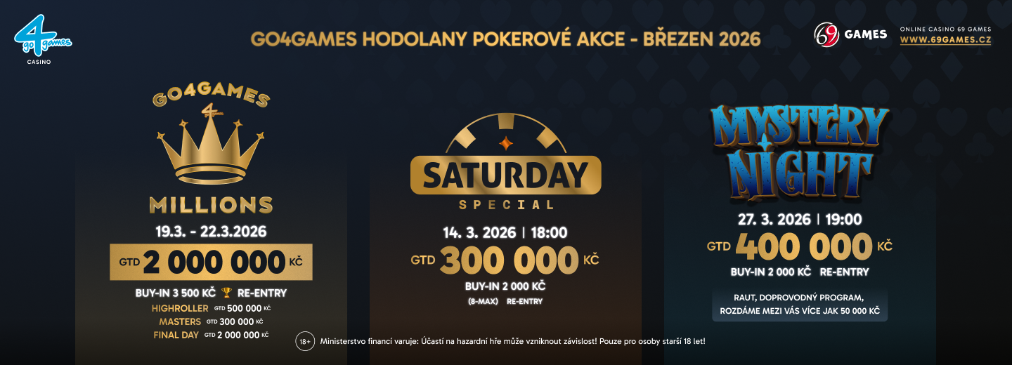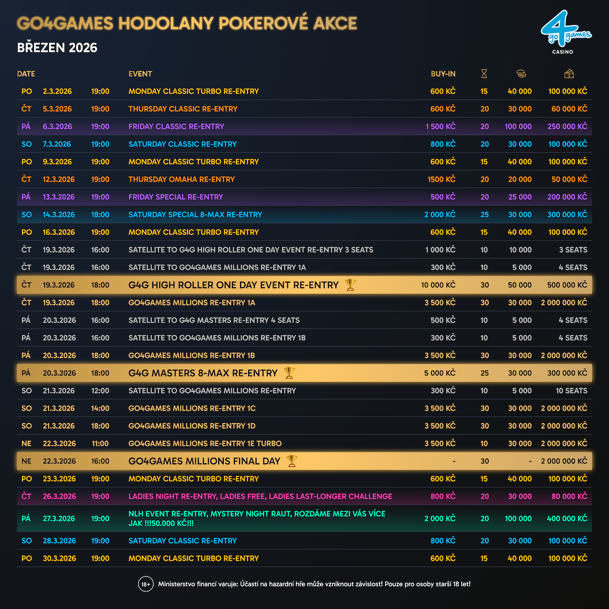 Klasiky i speciály, omaha i Hold`em, turnaje s měnšími buy-iny i High Roller za desítku a vrchol měsíce v podobě dvoumilionových Go4games Millions. V březnu si v Go4games Hodolany vybere opravdu každý.
