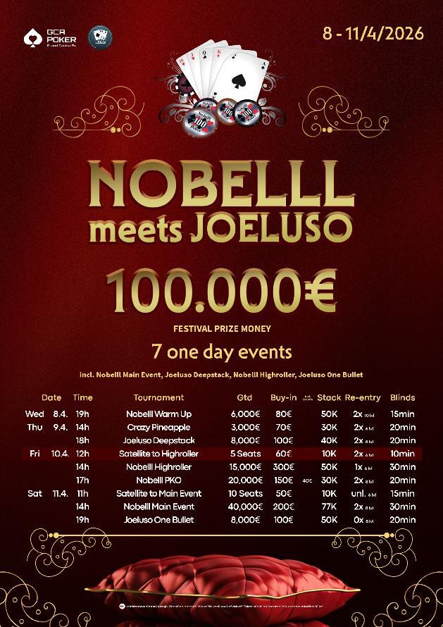 Ve středu 8. dubna startuje na západě Čech v Grand Casinu Aš další pokerový festival, Nobelll meets Joeluso. Dohromady se od středy do soboty bude hrát sedm jednodenních eventů o celkem €100.000!