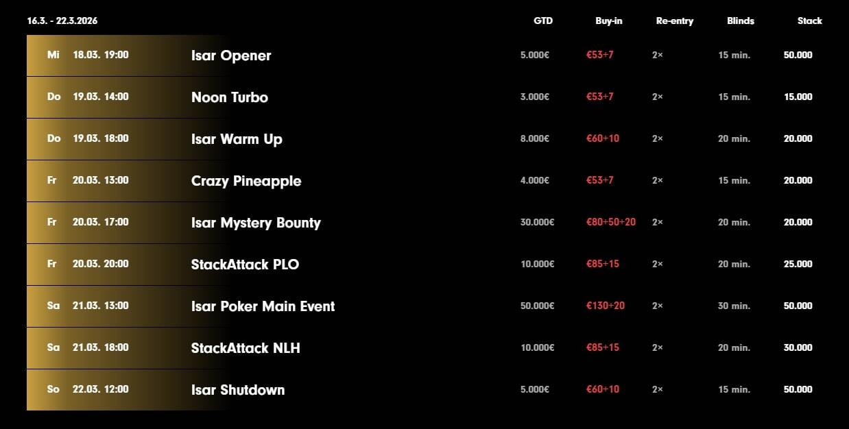 Od středy do neděle se v Grand Casinu Aš uskuteční devět jednodenních turnajů v rámci Isar Poker Festivalu, který přináší festivalové prize money v minimální výši €125.000!