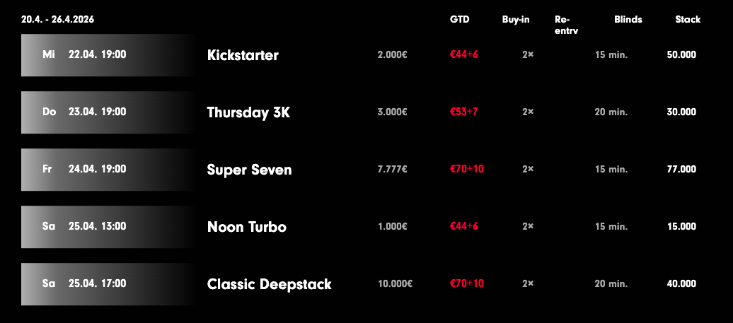 Nejzajímavější akce je naplánována na víkend. V pátek je připravený Super Seven event se zápisným €80 a garancí €7.777 a v sobotu pak zahřívací Noon Turbo a následně vrchol celého týdne - Classic Deepstack s buy-inem €80 a garancí €10.000. Deepstack nadzvedne oponu v 17:00.