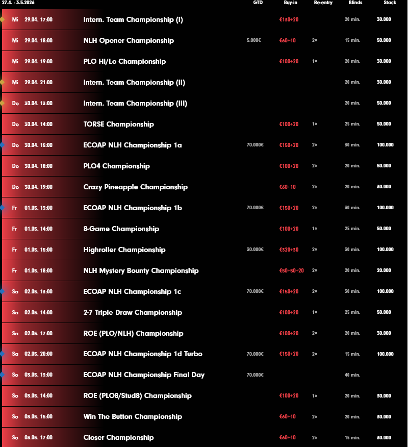V Grand Casinu Aš už se ale vše pozvolna připravuje na další velký pokerový festival, kterým bude ECOAP Championship s Main Eventem za €170 a garancí €70.000. V programu festivalu nechybí ani týmový event.